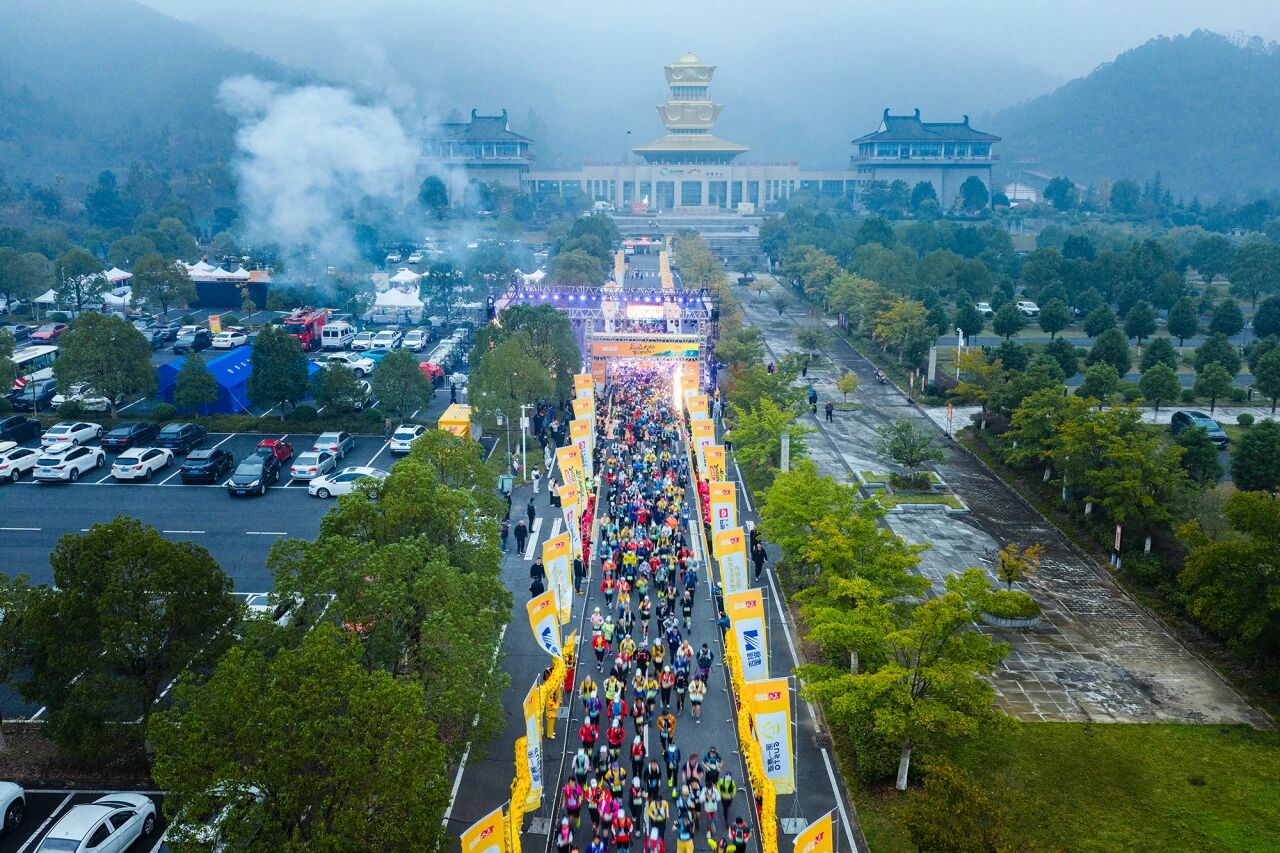 参赛选手奔跑的身影跃动在千年楚风古道之间。山脊线上绵延的队伍,宛如一条律动的脉搏,为沉睡的山川注入了蓬勃的生命力。