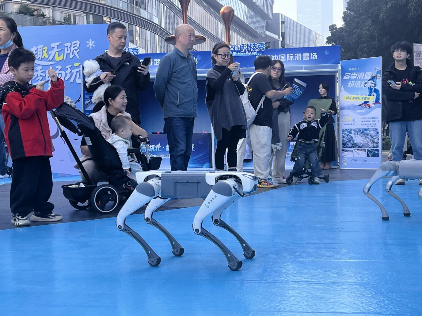 依托鄂旅股份丰富的科技文旅实体资源,酷驰科技打造的展示现场极具吸引力。其中萌趣十足的机器狗成为展会的“人气明星”,灵活的走位、精准的跳跃转圈,加之配合音乐节奏的专业伴舞表演,每一个动作都引得围观市民阵阵欢呼,成功圈粉各年龄段观众。