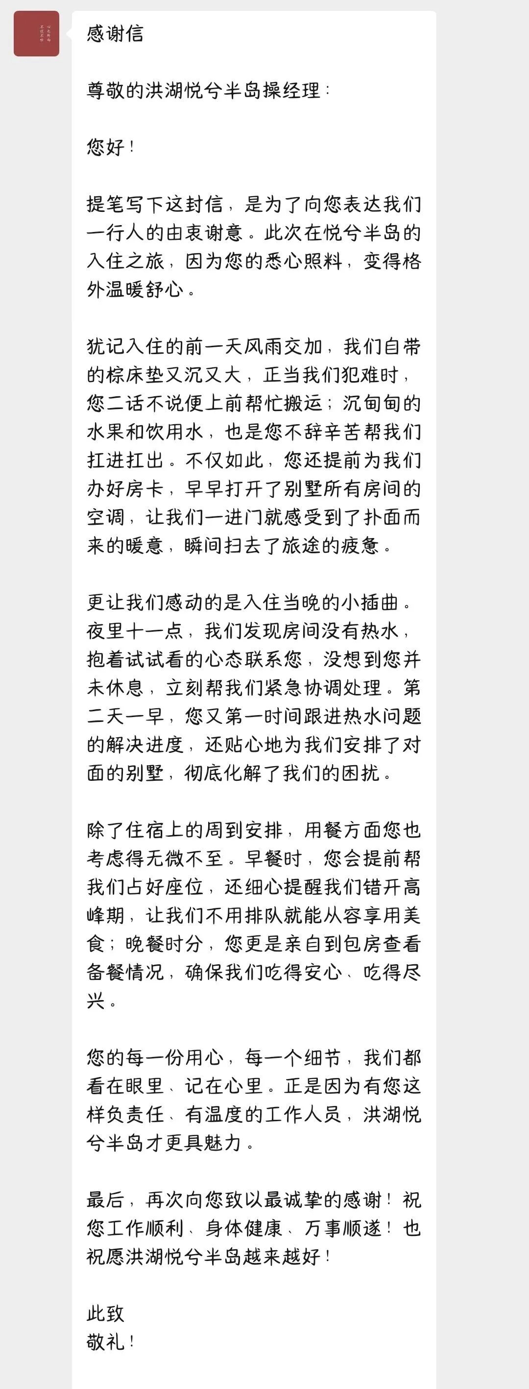 “这些举动,让我们觉得不是来度假,而是回了另一个家。”感谢信中的话语,映照出悦兮半岛一贯的服务理念——将标准融入行动,让关怀生于细节。