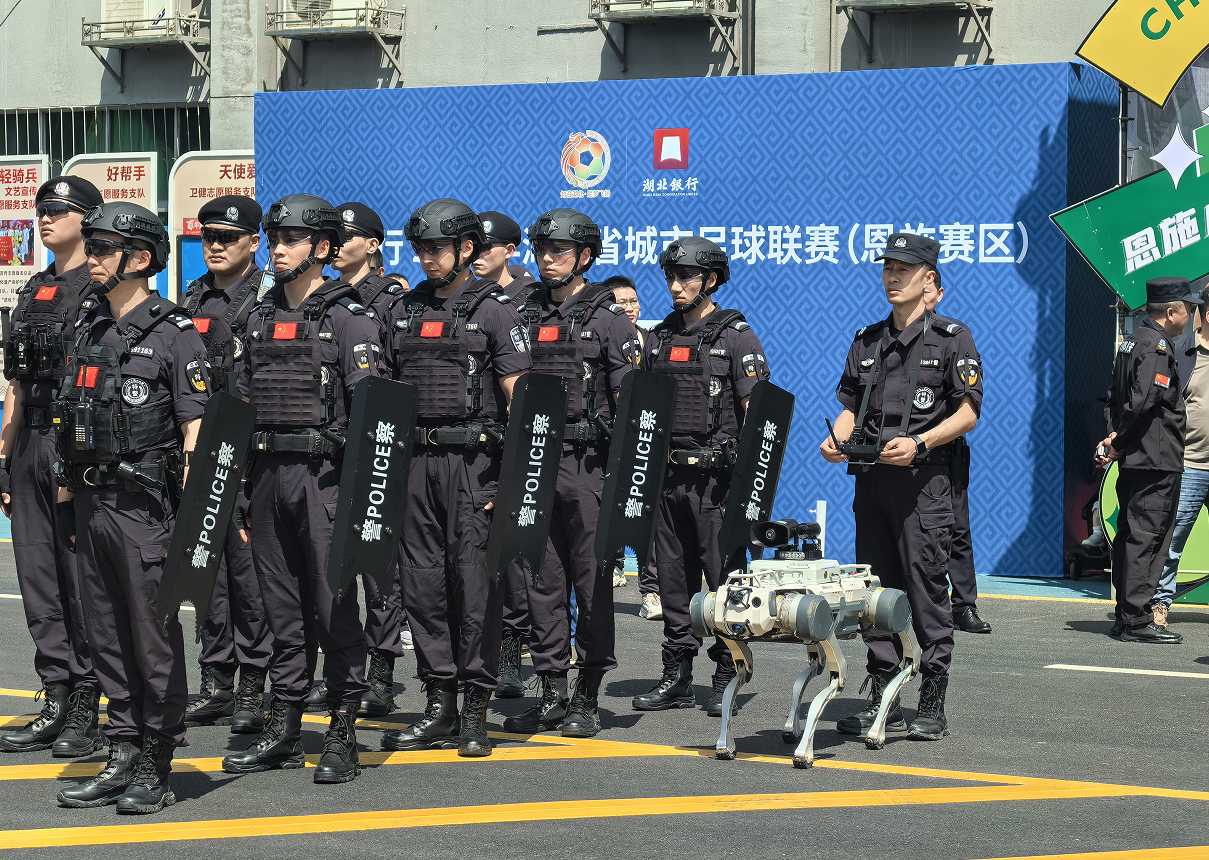赛事安保方面,楚超(恩施赛区)揭幕战期间,X30机器狗进驻恩施市体育中心,配合特警开展常态化巡逻,全方位保障赛事安全有序举办。