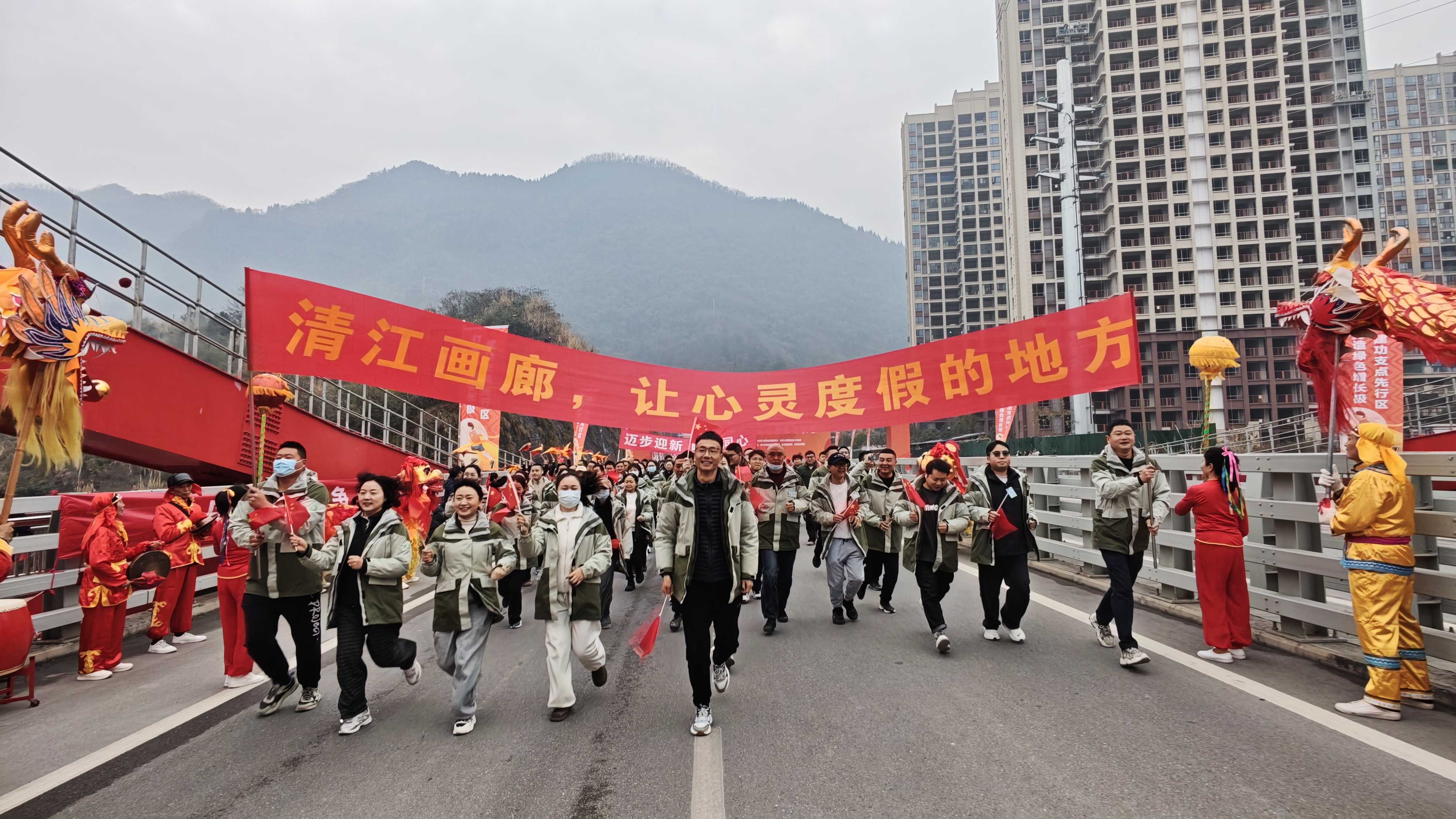 上午10时18分,起跑令响,34个方阵如离弦之箭般出发。本次长跑路线从观音阁清江大桥出发,经纱帽山隧道至鸡母溪折返,全程约10公里。清江画廊职工统一身着绿色冲锋衣,高举“清江画廊,让心灵度假的地方”的宣传横幅,挥舞着鲜艳小红旗,奔跑中尽显昂扬斗志与奋发精神。