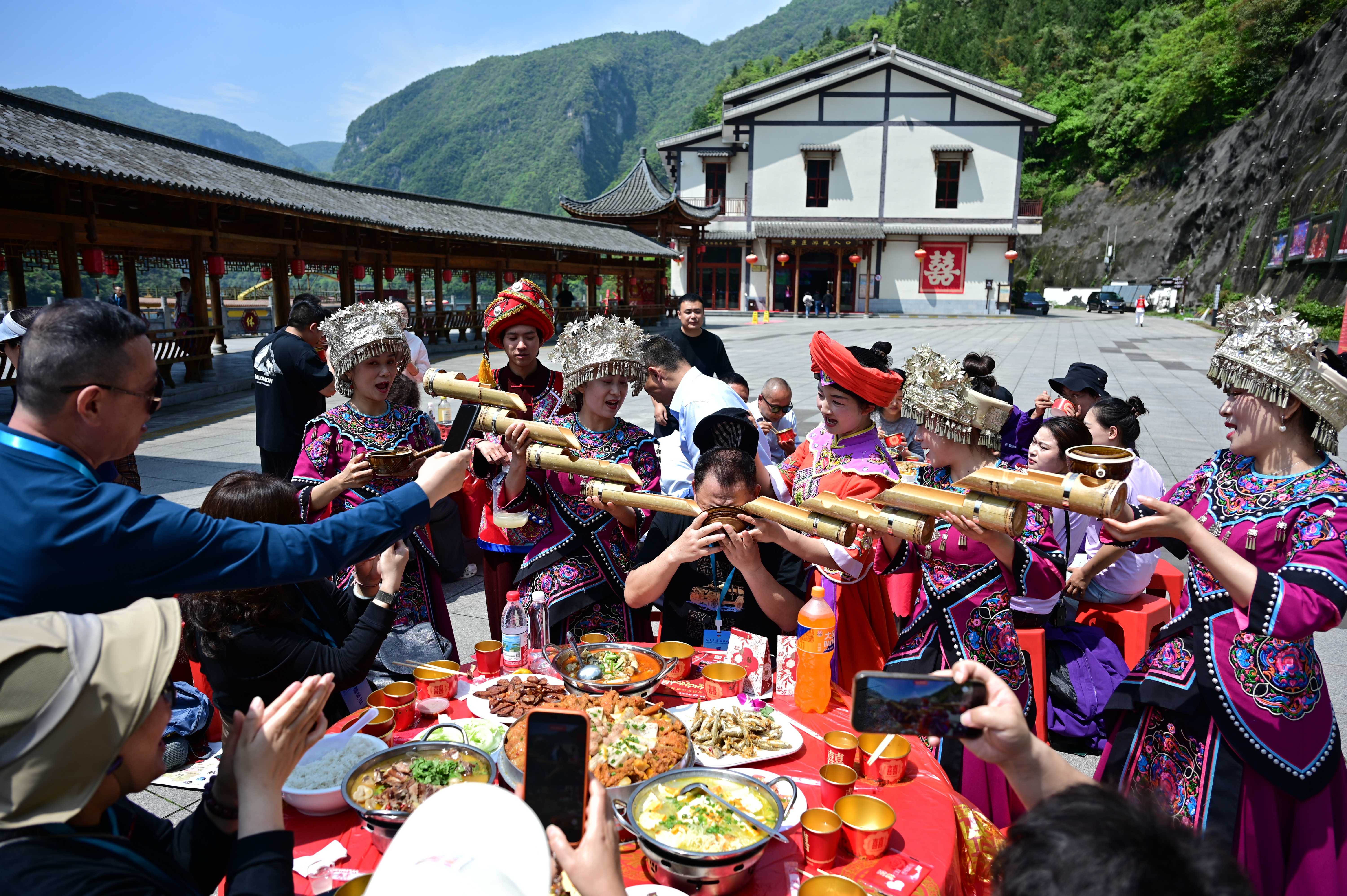 在迎宾环节,土家吹打乐、长阳山歌、巴山舞及“花神酿”敬酒礼等非遗互动场景,让考察团迅速融入土家文化氛围。全新打造的“花神下凡”互动场景,获得代表们一致好评。