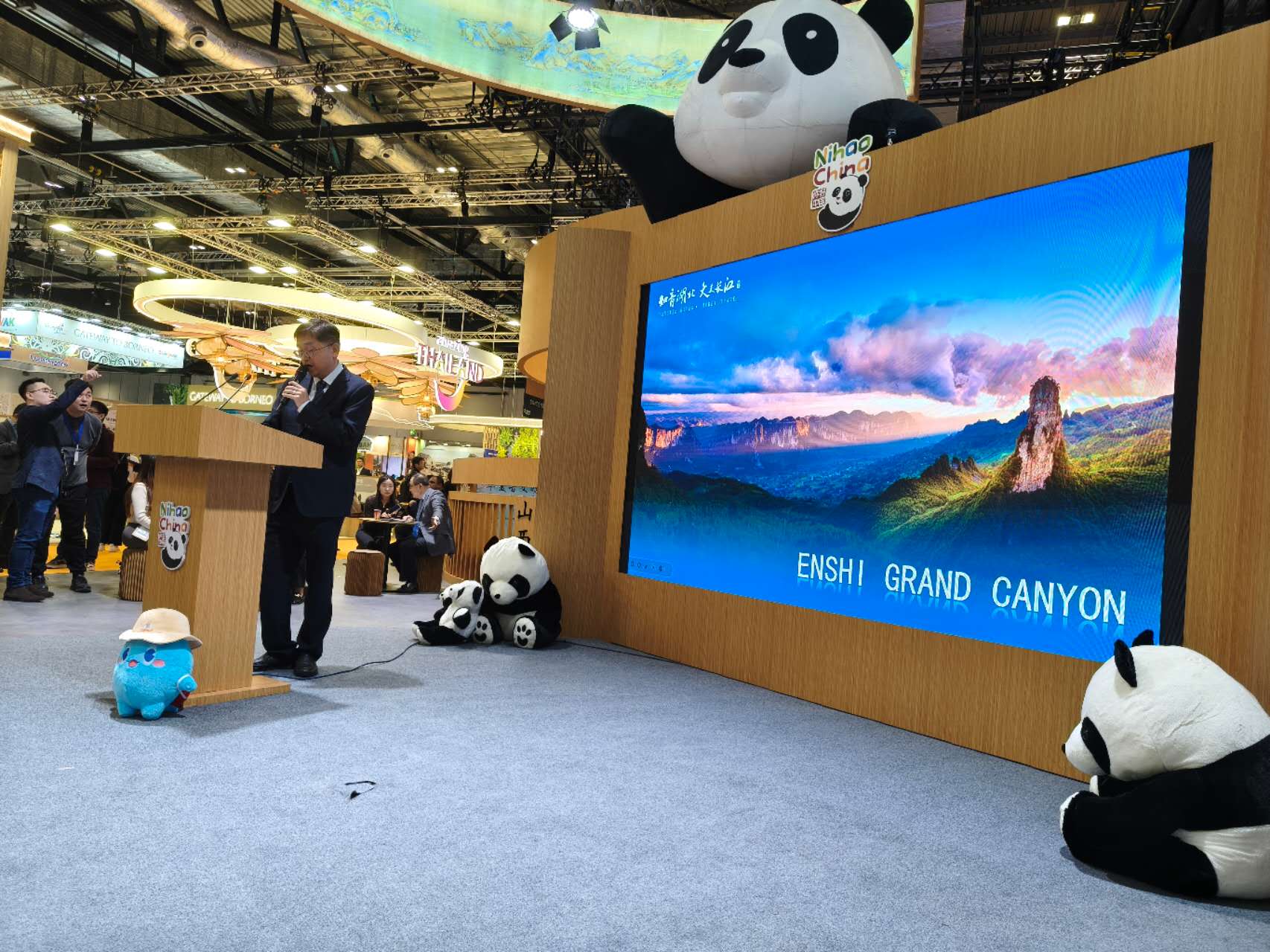 开幕式当天,湖北省文化和旅游厅在中国展区举办了“知音湖北 大美长江”专场推介,重点展示了“神武峡”“壮美长江”“楚文化”“武汉Citywalk”以及“湖北地质之旅”等五大主题入境游线路,同时介绍了“欧洲—湖北”航线及多种旅游套餐产品。这些线路和产品涵盖领域广泛、类型丰富、体验多元,吸引了众多与会旅行商和当地媒体的关注。恩旅集团旗下恩施大峡谷景区在推介中精彩亮相,恩旅集团参展代表在湖北展区向各国嘉宾介绍了旗下优质旅游资源,引起广泛兴趣。现场展示的恩旅文创产品也受到与会者的欢迎与好评。
