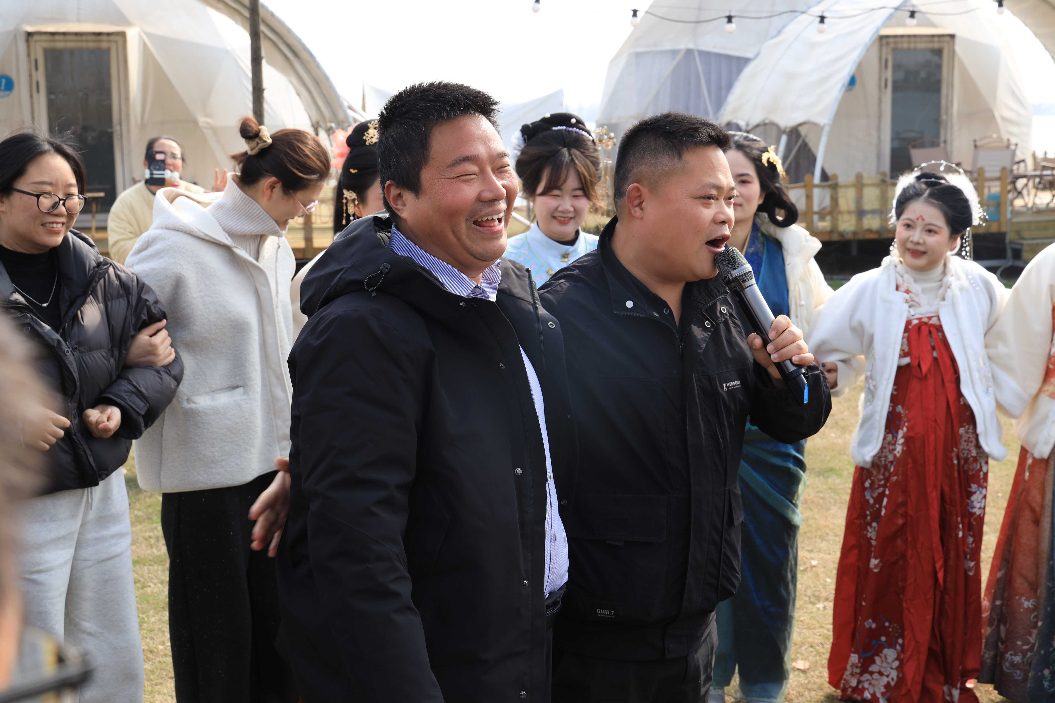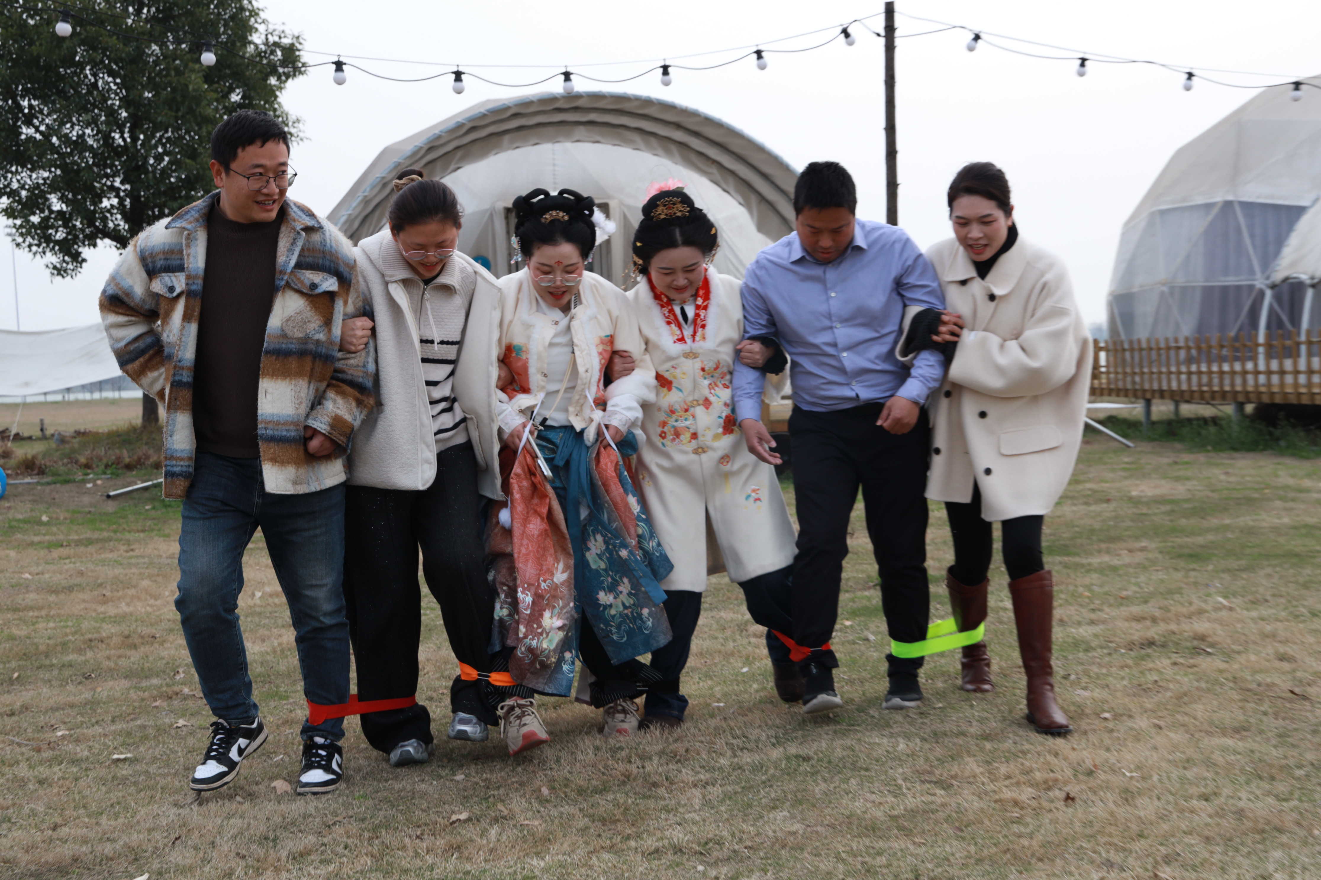 本次活动精心设计了同心齐力、两人三足、高山流水等轻松有趣的互动项目。团建过程中,大家并肩参与、默契配合,不分彼此、其乐融融。互动环节后,大家围坐在一起,畅谈工作与生活,分享心声与感悟,围炉煮茶暖意融融,烧烤香气扑鼻而来。身着汉服的女职工们,在沔阳小镇的古风场景中自由拍照打卡,定格美好瞬间,整个现场温馨又热闹。