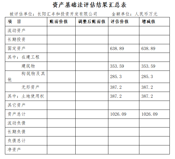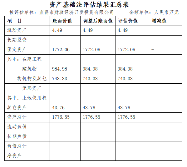 湖北清江画廊旅游开发有限公司西游客接待中心及财岛酒店提档升级项目资产收购及实物增资由湖北中德诚资产评估有限公司以2025年11月30日为基准日进行评估,并出具了《湖北清江画廊旅游开发有限公司拟收购资产涉及的宜昌市财政经济开发投资有限公司分布在长阳财苑宾馆(原长阳财苑山庄)相关资产组项目资产评估报告》《长阳汇丰和投资开发有限公司拟实物增资湖北清江画廊旅游开发有限公司涉及的长阳财苑宾馆(原长阳财苑山庄)相关资产组项目资产评估报告》,2026年1月9日经专家评审通过。现对评估结果进行公示: