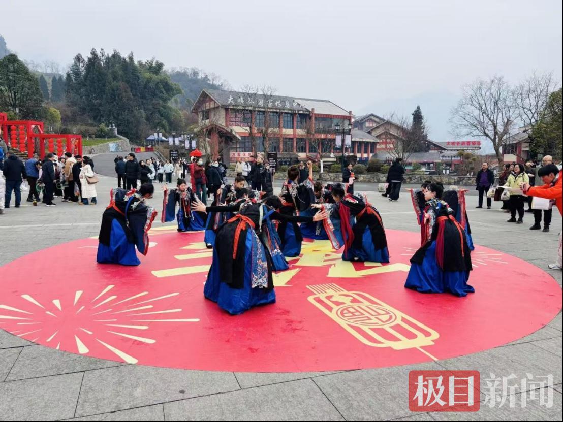 作为整场活动的核心,“祈福运”环节更是将文化厚重感推向高潮。千年非遗傩舞复原表演惊艳亮相,傩面舞者们以古朴苍劲的肢体语言,演绎着土家先民驱邪纳福、祈愿安康的古老传统,尽显非遗文化的庄严与神圣。随后,悠扬古乐响起,庄重的祈福词恭读仪式举行,声声祝愿响彻峡谷:一祈国泰民安,二祈身体健康,三祈事业腾飞,四祈福寿绵长,将最真挚的新春期许送给了现场每一个人。