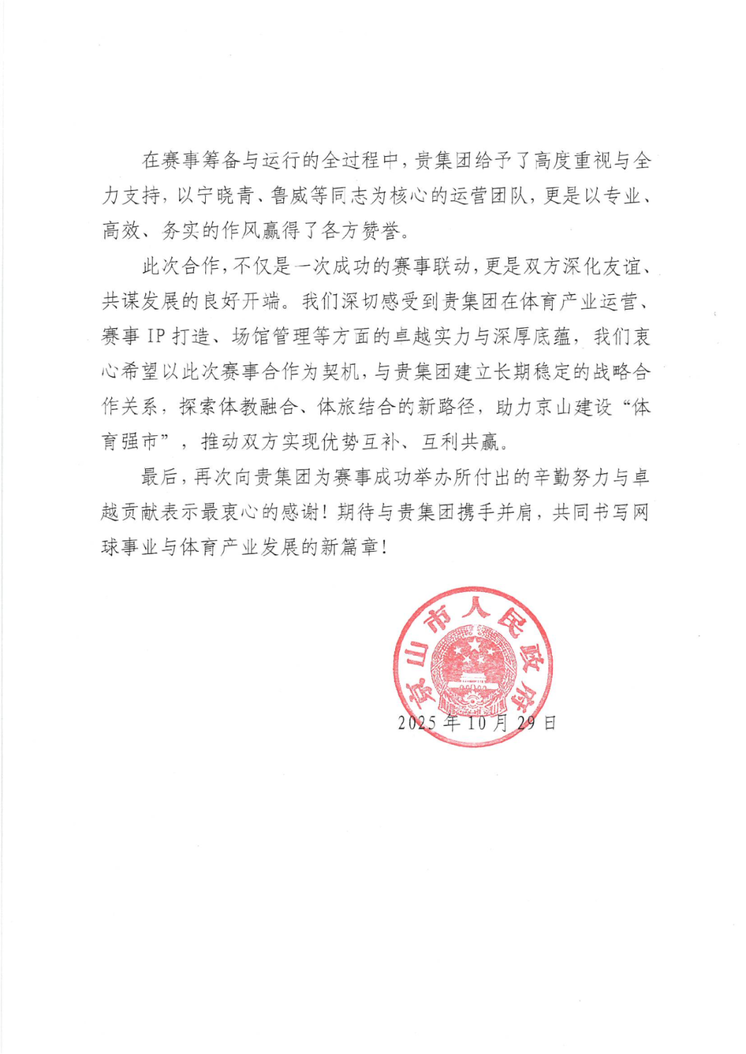 同时,集团将赛事与京山深耕数十年的网球产业基础深度融合,推动体育消费从“单一赛事参与”向“全链条体验消费”升级,构建起“赛事 IP 引领、文体旅商联动、政企校协同”的发展新格局。