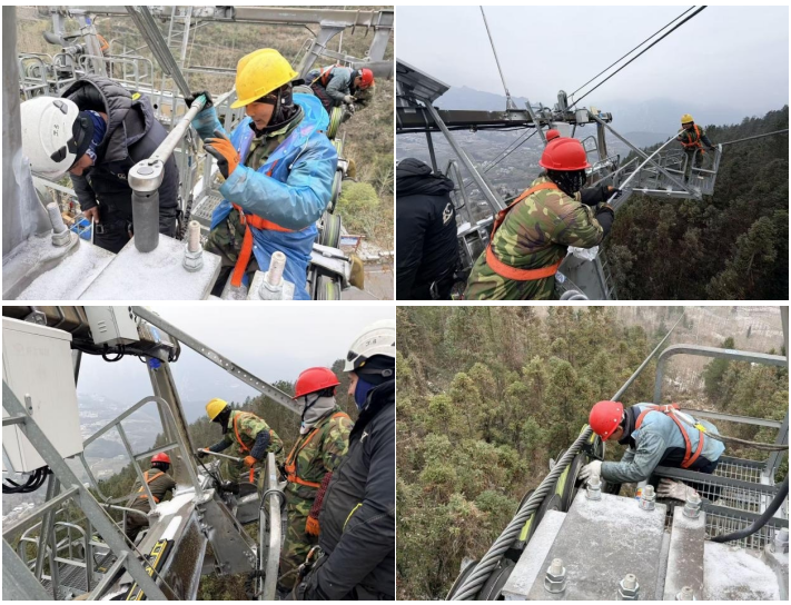 在维保期间,鄂旅股份索道运营团队采用模块化检修工艺,显著提升了维保检修效率;严格执行毫米级安装精度与双重探伤标准,全程严格把控质量,为索道安全平稳运行奠定了坚实基础。同时,团队克服了低温冰冻气候、高空作业等多重不利因素,通过倒排工期、争分夺秒的方式,如期完成全部检修任务。经试运行验证,整机设备各项指标均符合《客运架空索道安全规范》(GB 12352-2018)要求,已完全具备对外营运条件。