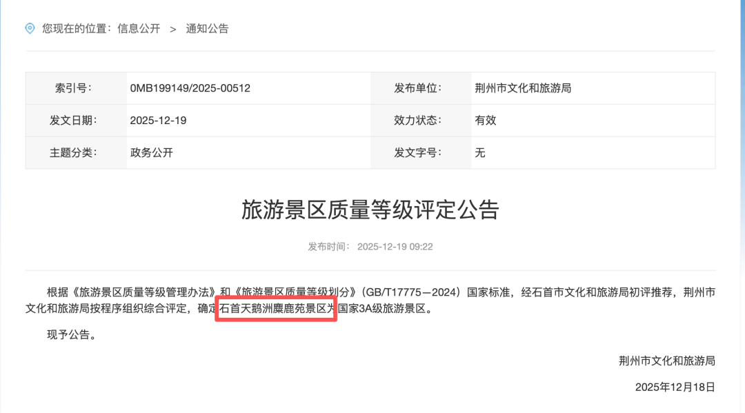 日前,湖北省文化和旅游厅发布《关于确定国家4A级、3A级旅游景区和省级旅游度假区的公告》,湖北文旅集团旗下荆州市石首桃源小镇景区、恩施大清江景区获评“国家4A级旅游景区”。荆州市文化和旅游局发布《旅游景区质量等级评定公告》,确定集团旗下石首天鹅洲麋鹿苑景区为“国家3A级旅游景区”。