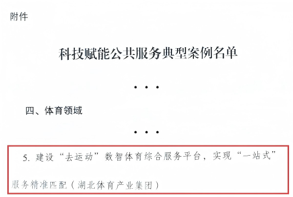 近日,国家发展改革委办公厅等5部门联合公布了一批“十四五”科技赋能公共服务典型案例名单,全国共30个案例。集团旗下湖北体育产业集团申报的《建设“去运动”数智体育综合服务平台,实现“一站式”服务精准匹配》成功入选,是湖北省唯一入选的体育领域案例。