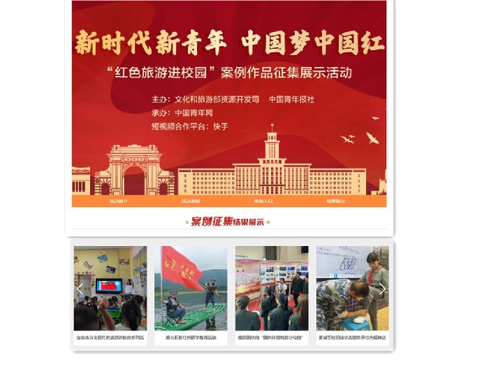 2020年11月以来,为深入学习贯彻习近平总书记关于用好红色资源、传承红色基因重要指示精神,文化和旅游部资源开发司、中国青年报社以“新时代新青年 中国梦中国红”为主题,组织开展了“红色旅游进校园”案例作品征集展示活动,共收集全国各地申报的有效案例近300个、短视频作品近600个,经专家组集中评议,遴选出“红色旅游进校园”优秀实践案例40个、短视频作品15个,并在中国青年网专题页面展示。
