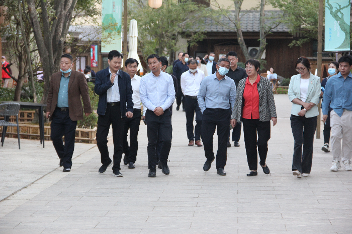 洪再林一行考察了游客中心、问梅村商业街、东山书院、凤源里社区等产品,详细了解问梅村商业街业态分布、经营模式及东山小镇开园运营接待等情况。