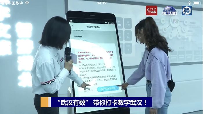 湖北广电主播与法国在汉留学生来到鄂旅投集团数字展厅详细了解了“一部手机游湖北”项目亮点及核心功能,并现场体验文旅场所分时预约、门票酒店预订、5G直播、智慧导览等功能。