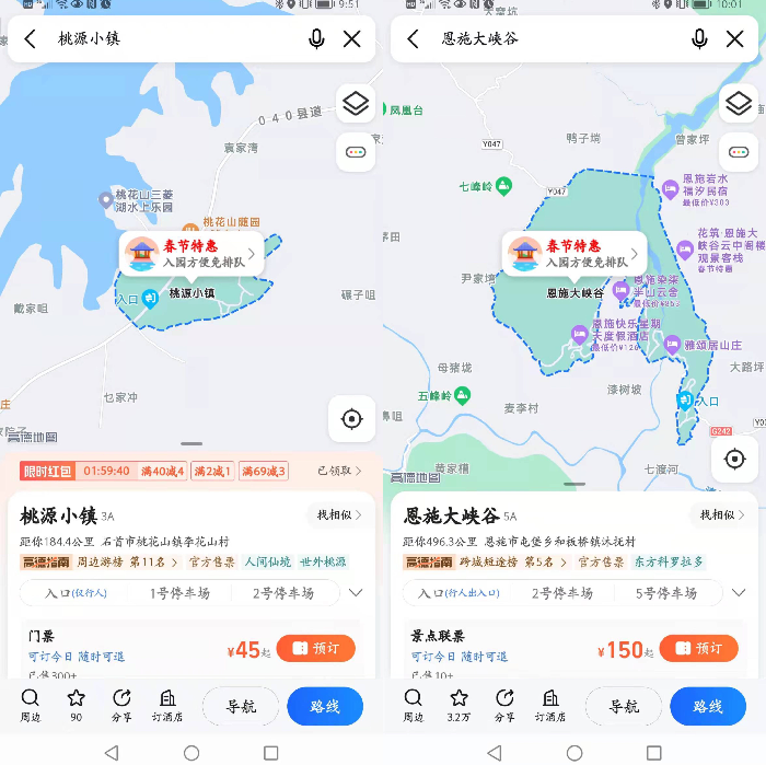图为高德地图恩施大峡谷、桃源小镇等景区上线样图