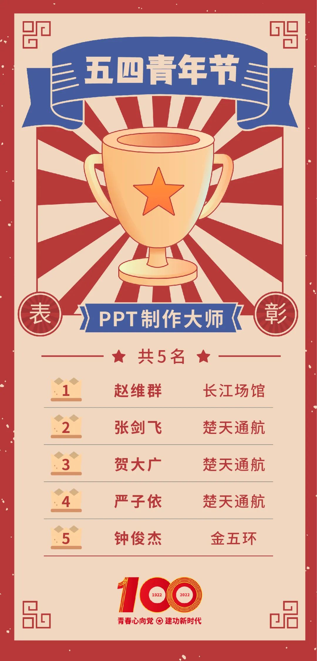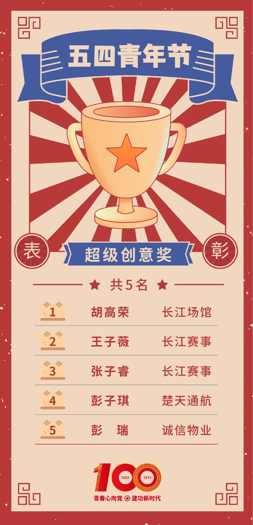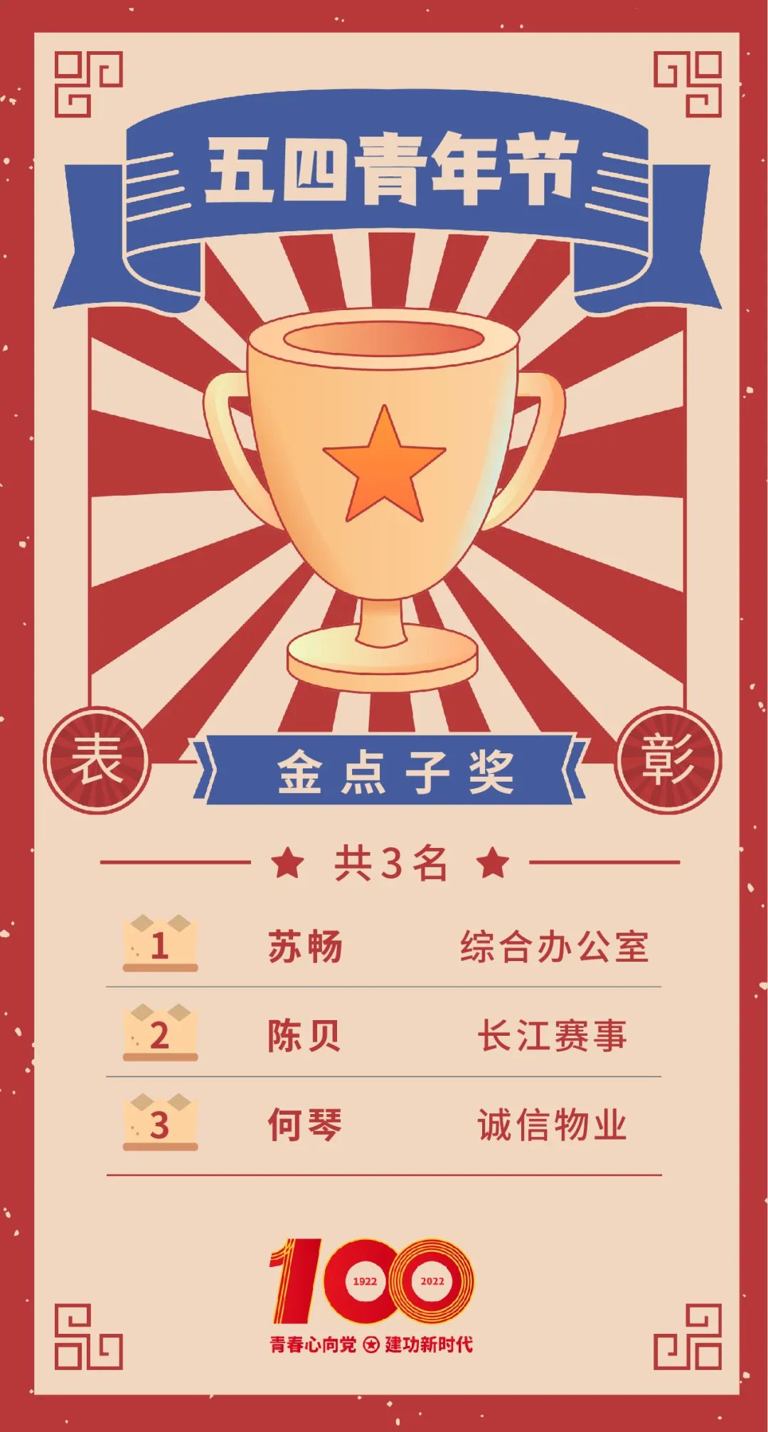 为表彰先进、树立典型,激励集团广大青年勇担时代重任,通过全体参会人员投票决定,授予苏畅等3名同志“金点子奖项”,授予胡高荣等5名同志“超级创意奖项”,授予曾琦同志“最佳风尚奖项”,授予张剑飞等5名同志“PPT制作大师”,体育集团领导李欣、邓成军、张少武出席活动并为获奖选手颁奖。