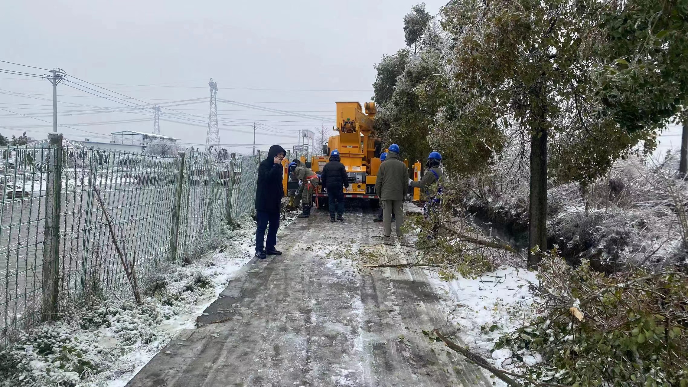 灾情就是命令。为全力保障悦兮半岛景区春节期间正常经营,洪旅集团组织全体党员干部开赴悦兮半岛,大家不畏严寒,踏着积雪,对景区道路两侧和温泉泡池、别墅、树屋等周边断枝进行清理,对景区积雪进行清除,清理内部交通要道,封闭非必要通行道路,保障景区内部车辆和游客通行畅通。从2月4日晚上到5日凌晨,电路抢修专班党员干部冒着低温雨雪,对10余公里的电路沿线进行巡逻,查找断电原因,积极对接乌林镇政府和洪湖市电力局,连夜抢修,及时供电。同时争取电信公司支持,迅速解决通讯问题。