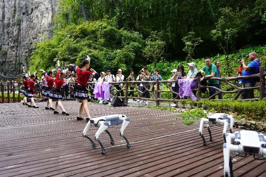 在景区迎客松处,旅行商热情打卡,合影留念,清江升白云的奇景让大家宛如登临仙境一般。在一炷香前,旅行商连连惊叹,感叹大自然的鬼斧神工。热情洋溢的土家族摆手舞与悠扬民歌交织,让嘉宾们沉浸其中,流连忘返。在景区大地山川,机器狗跳起舞蹈,外骨骼整装待发,无人机带飞的VR视野将峡谷全貌尽收眼底,让大家以“上帝视角”饱览大峡谷的雄奇壮美。