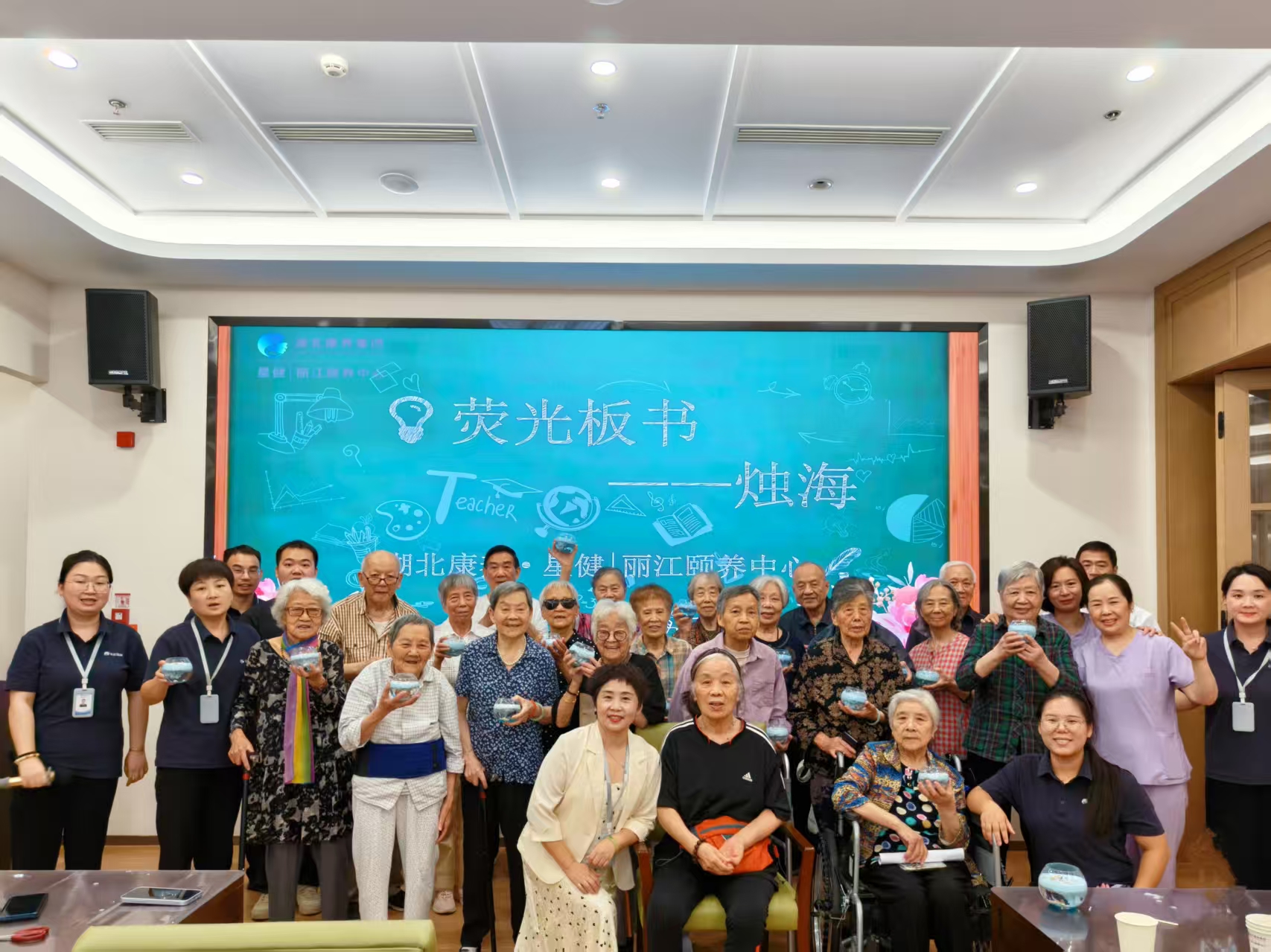 伴随着悠扬旋律共同唱响经典曲目《好一朵美丽的茉莉花》,退休教师们手持亲手制作的海洋蜡烛成品合影留念,摇曳烛光映照着长者们的育人初心,熠熠银龄彰显着教育工作者的崇高风范。这一刻,大家用歌声礼赞教师群体的高尚品格,敬意与温情在跳动火焰与晶莹蜡烛间交融流淌,不仅定格成长者们心中珍贵的节日记忆,更成为湖北康养坚守国企使命、传递人文温度、服务银龄群体的鲜活实践缩影。