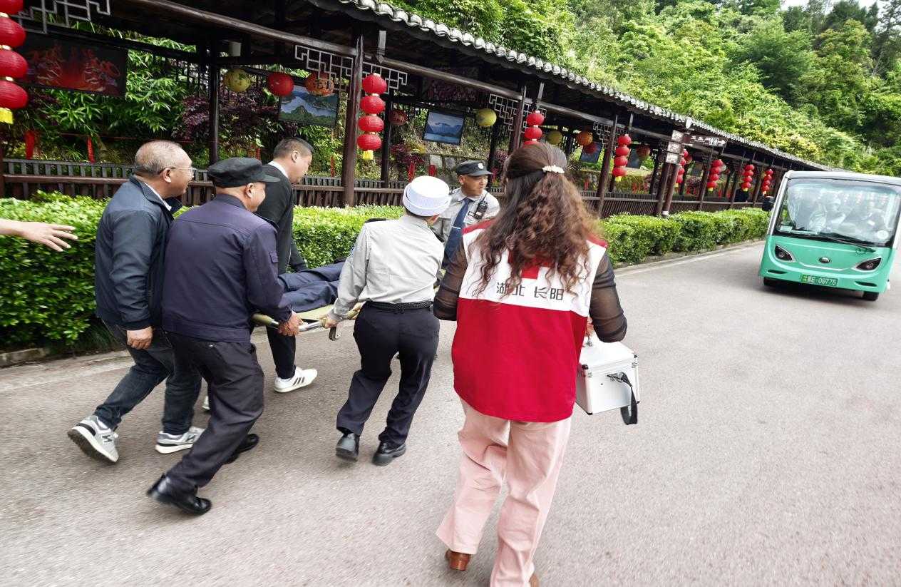 本次演练坚持“贴近实战、注重实效”,模拟景交车在运营途中突发碰撞、导致游客“受伤”的险情。指令下达后,各应急小组迅速响应、协同处置。从事故初步报告、现场安全警戒设置,到伤员初步救护、游客情绪疏导与秩序维护,全流程衔接紧密、操作规范,完整呈现了标准化应急处置程序。
