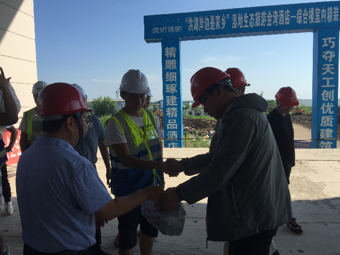 连日来,洪湖市一直持续高温,室外温度高达35℃以上。为保高温天气下一线施工人员身体健康,洪旅集团开展了送清凉活动。每到一处,任超都与坚守在高温一线的施工现场人员一一握手交谈,并将防暑物品送到他们的手中,关切地询问他们的工作情况和身体状况,对他们战高温斗酷暑,全力保障金湾酒店项目顺利推进表示衷心的感谢,并一再叮嘱现场施工人员在高温下要注意防暑降温和施工安全。