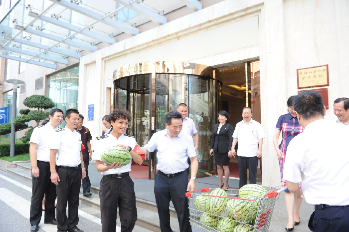 盛夏七月,骄阳似火,酷暑难当,气温节节攀升,连日的高温天气,让洪宾集团领导班子时刻牵挂着在高温下坚守岗位的一线职工。7月24日上午,洪宾集团党委书记、董事长万幼云,总经理张涵带领班子成员对洪山宾馆、丽江饭店室外安全保卫、前厅对外接待、工程施工等岗位职工进行了慰问,把西瓜、盐汽水等防暑降温物品送到一线职工手中。万幼云感谢一线职工炎热酷暑环境下的辛勤劳动,叮嘱大家在做到安全生产的同时,一定要做好防暑降温的劳动保护工作,劳逸结合,保护好身体。同时,要求集团工会和各部门做好防暑降温工作。