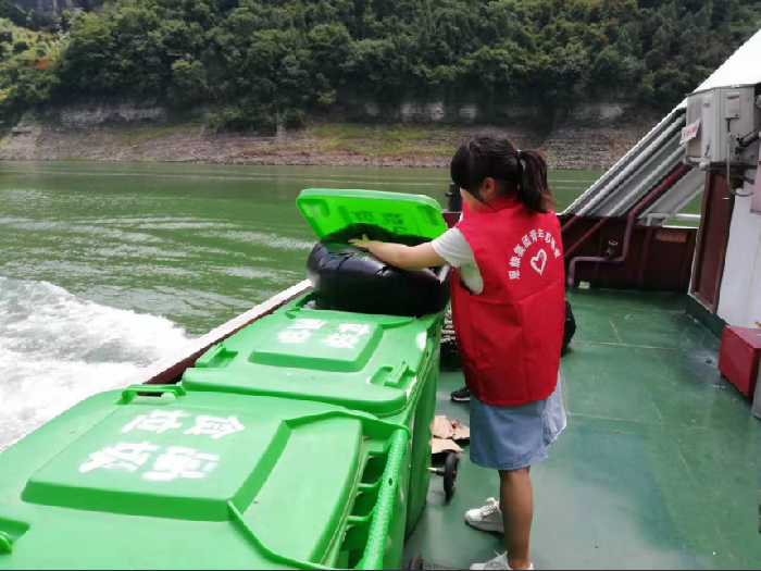 (在游船上分类投放垃圾)