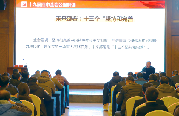 周永彪围绕党的十九届四中全会讲话精神,详细阐述了十九届四中全会的基本情况和重大意义,全面阐释了中国特色社会主义制度和国家治理体系的显著优势,系统解读了全会《决定》提出的总体要求、总体目标和重点任务,并对贯彻落实全会精神提出要求。