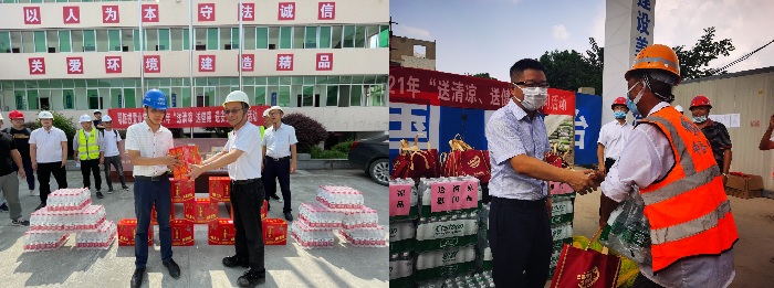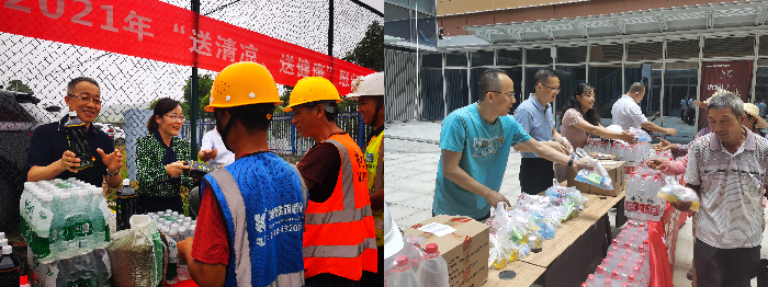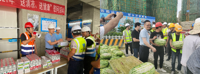 从7月下旬至8月上旬,集团董事长傅健,党委副书记、总经理王学军,党委副书记、副总经理罗德才,党委委员、纪委书记、工会主席张海,党委委员、副总经理兼总会计师刘新峰,党委委员、总工程师许玉发分别带队,前往襄阳耕读小镇、神农架项目部、光谷总部中心、珞珈国际、四新项目部、严西湖项目部、物业公司等建设一线,看望慰问分布在荆楚各地的10个在建项目的员工和1000多名工人。每到一个项目,集团领导都为一线建设人员送去西瓜、矿泉水、药品等防暑降温物资,详细了解一线员工的生活、工作以及项目进展情况,并要求施工单位合理安排作息时间,确保工人身心健康和生产安全。