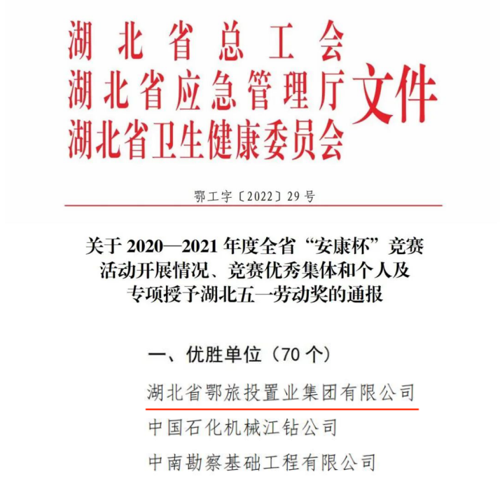 湖北省总工会近期发布《关于 2020—2021年度全省“安康杯”竞赛活动开展情况、竞赛优秀集体和个人及专项授予湖北五一劳动奖的通报》,授予湖北省鄂旅投置业集团有限公司《2020—2021年度湖北省“安康杯”竞赛活动优胜单位》的荣誉称号。对其通过牢牢把握竞赛贡献导向、实效导向的原则,经过自下而上、逐级把关、择优推荐、严格审核的工作程序,在助推全省安全生产形势持续向好的示范带头作用予以了肯定。