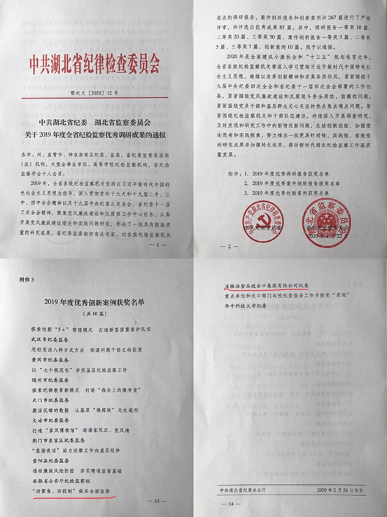 近日,湖北省纪委、监委印发《关于2019年度全省纪检监察优秀调研成果的通报》,粮油集团纪委《“四聚焦、四机制”做实全面监督》获2019年度全省纪检监察优秀创新案例奖,属国有企业唯一获奖案例。