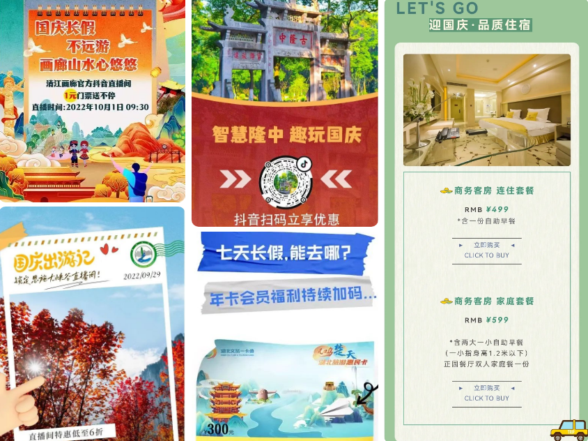 为抢抓假期市场,集团紧跟“直播带货”热点,线上新媒体平台持续发力。恩施大峡谷对全国医护人员免门票入园,推出“观抖音直播号,购6折景区联票”活动;荆门爱飞客极客公园举办“星河不夜城”活动,推出转发朋友圈入场门票免费送、部分游乐设施免费畅玩。洪山宾馆在线推出特色房餐优惠套餐。“游湖北”平台把握国庆市场,抢抓“惠游湖北”窗口期,冲刺湖北旅游惠民卡推广,累计服务在线游客逾10万人次。