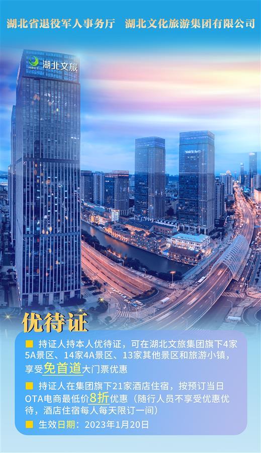 为展示国企担当和拥军情怀,集团党委委员副总经理吴传彪代表湖北文旅集团与湖北省退役军人事务厅签约,对持优待证的退役军人和烈士遗属、因公牺牲军人遗属、病故军人遗属到湖北文旅集团旗下景区和酒店给予优惠优待。