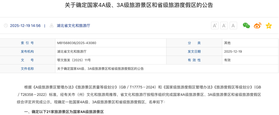 日前,湖北省文化和旅游厅发布《关于确定国家4A级、3A级旅游景区和省级旅游度假区的公告》,湖北文旅集团旗下荆州市石首桃源小镇景区、恩施大清江景区获评“国家4A级旅游景区”。荆州市文化和旅游局发布《旅游景区质量等级评定公告》,确定集团旗下石首天鹅洲麋鹿苑景区为“国家3A级旅游景区”。