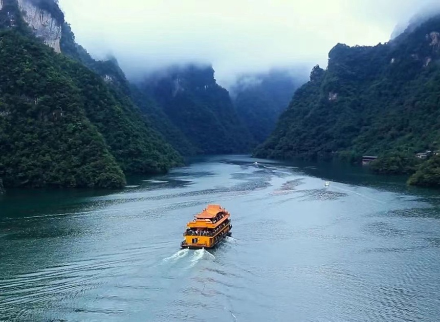 雨后的清江画廊,宁静沉默。云雾在绵延的山峰之间翻涌,时而聚集,时而消散,幻化成了海市蜃楼般的美景——层层涟漪的江水碧波荡漾,似刀劈般的陡峭山峰和碧绿的江水,形成了如梦幻中的仙境。