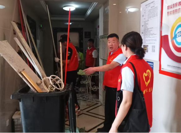 图为建发集团“书院世家物业”党员服务队清理楼栋杂物