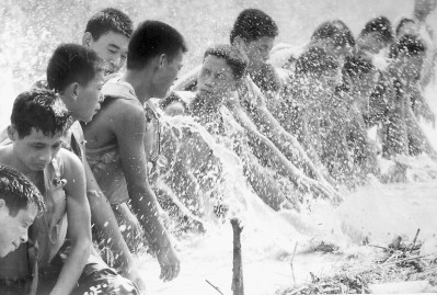 1998年抗洪抢险中,面对汹涌的洪水,战士们跃入江中,用自己的身体筑成一堵防波堤。新华社记者拍摄/资料图片