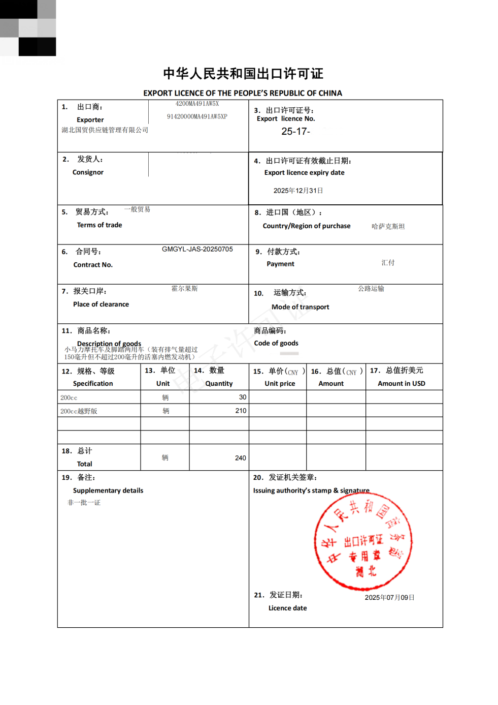7月20日,湖北国贸集团旗下国贸供应链公司自主运营的首批240台国产摩托车,经霍尔果斯口岸顺利通关并成功运抵哈萨克斯坦阿拉木图市。这标志着集团在出口领域再次实现突破,全球化供应链体系建设迈上新台阶。